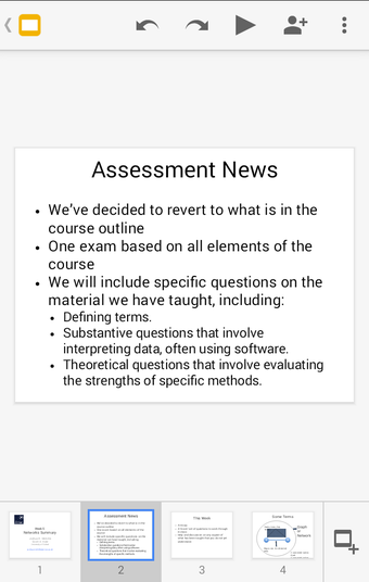 Slides fungerar bäst som ett verktyg för yrkesverksamma eller studenter som vill granska eller justera sina presentationer när de är på språng. Det fungerar inte bra som en fullfjädrad redigerare, men erbjuder istället ett enkelt sätt att granska och (med lite justering) redigera presentationer.