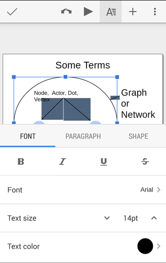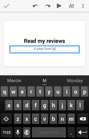 Tyvärr känns det inte särskilt intuitivt att skapa presentationer. Det finns inte mycket du kan göra för att redigera en fil förutom att ändra texten och omstrukturera slides. Den synkroniseras med allt du har på Google Drive, så den kommer att upptäcka eventuella presentationer du kanske har sparat där och ta upp dem. Att konvertera presentationer och exportera dem som PowerPoint för att göra något så enkelt som att redigera känns klumpigt och motstridigt.